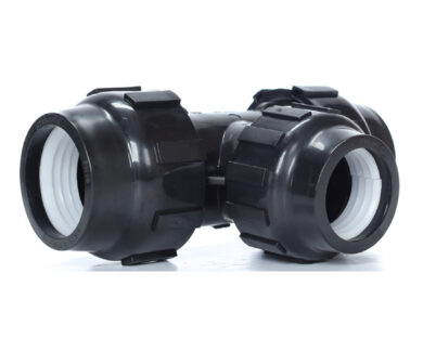 A reducing tee fitting with a 90° angle, designed to connect pipes of different sizes at ...